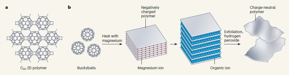 Zheng Jian’s group has developed a synthesis strategy for preparing new carbon materials (Figure. 2). They successfully prepared a single-layer polymerized C60 single crystal, and have identified its crystal structure. By adjusting the ratio of magnesium to C60, two closely aligned magnesium intercalated polymer single crystals, quasi hexagonal and quasi tetragonal phase, were obtained at atmospheric pressure. An organic cation slicing strategy was then employed to exfoliate the intercalated quasi hexagonal C60 single crystals into monolayer with tetrabutylammonium salicylate as an exfoliation reagent. The results of single crystal X-ray diffraction and scanning tunneling electron microscopy show that adjacent C60 is connected by carbon-carbon bridged single bond and [2+2] cycloaddition bridged bond in one layer of qHP C60, forming a new two-dimensional topological structure. This research adds a new member to the family of carbon materials. The method of constructing two-dimensional topological structure using zero dimensional clusters provides a new prospect for exploring new carbon materials.
